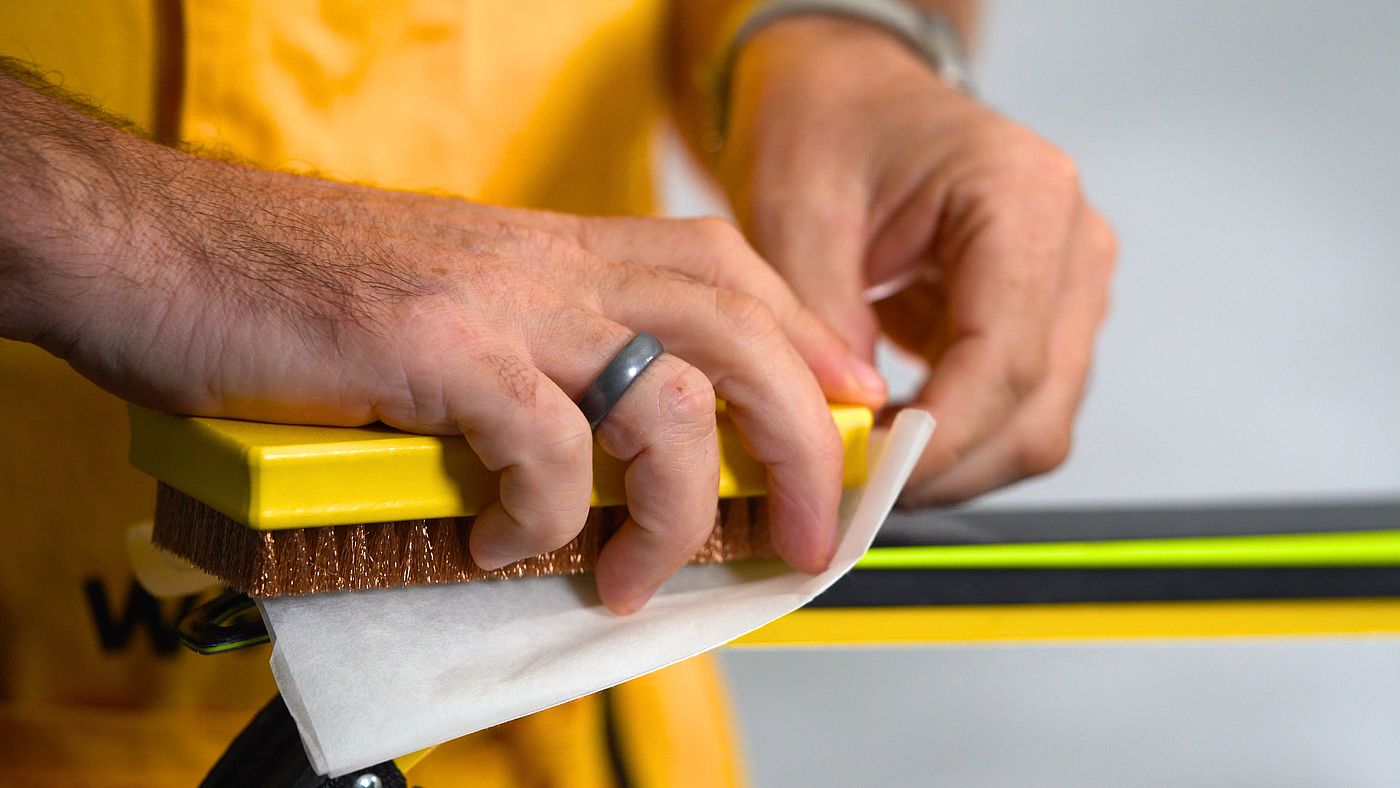 An important first step to achieve the best results when fluorine cleaning your skis is to spotless clean the base. Do not underestimate the importance of this step, as a clean base is the foundation for an effective fluorine treatment. Make sure you get a high-quality oval brush made of copper or steel. These brushes are ideal for penetrating deep into the base structure and removing stubborn dirt. Make sure the decking is dry to achieve optimum cleaning results. Start by opening the base. Use light pressure to guide the brush in a straight line over the flooring. Also be sure you cover the entire surface of the flooring and concentrate particularly on high-traffic areas such as the